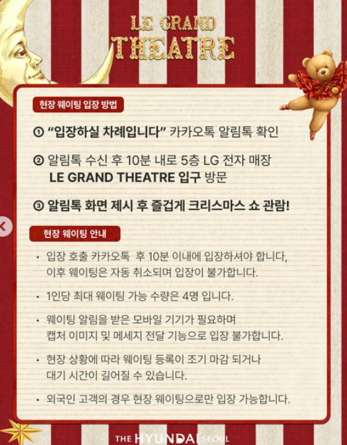 크리스마스 빌리지를 방문하기에 가장 좋은 시간대는 무엇일까요? 작년 기준으로, 낮 시간대는 정말 많은 인파로 붐비는 핫플레이스였습니다. 많은 사람들이 함께 몰리는 만큼 대기 시간이 3시간을 넘는 경우도 있었습니다. 그렇다면 늦은 시간에 방문하는 것이 어떨까요? 백화점의 운영 시간은 일반적으로 8시까지입니다. 하지만 팝업 기간 동안은 10시까지 운영하기도 하니, 이용 가능한 시간을 잘 고려해 보세요.